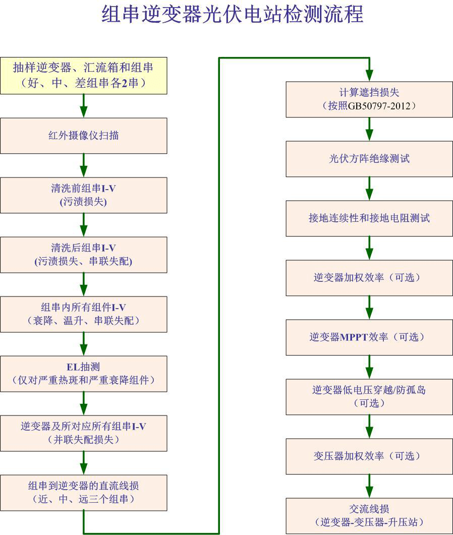 對(duì)于光伏電站第三方檢測(cè)機(jī)構(gòu)或者運(yùn)維服務(wù)公司等,一般會(huì)參考“規(guī)范”第九章節(jié) 光伏電站性能測(cè)試內(nèi)容進(jìn)行測(cè)試。參考眾多光伏檢測(cè)機(jī)構(gòu)的主要檢測(cè)項(xiàng)目,在光伏電站現(xiàn)場(chǎng)可開展的檢測(cè)項(xiàng)目包括:紅外攝像(熱斑檢查),污漬遮擋損失,光伏組件性能衰降,光伏組串溫升損失,光伏組件/組串的串并聯(lián)失配損失,EL測(cè)試,光伏方陣相互遮擋損失,直流線損,交流線損,光伏方陣絕緣測(cè)試,接地連續(xù)性測(cè)試,逆變器效率,并網(wǎng)點(diǎn)電能質(zhì)量。對(duì)于諸如逆變器MPPT效率,變壓器效率,并網(wǎng)性能測(cè)試(孤島保護(hù)、有功/無(wú)功功率控制能力、低電壓穿越以及電壓/頻率適應(yīng)能力驗(yàn)證)等測(cè)試內(nèi)容,由于更多涉及的是并網(wǎng)環(huán)節(jié),或在現(xiàn)場(chǎng)無(wú)法開展的項(xiàng)目。