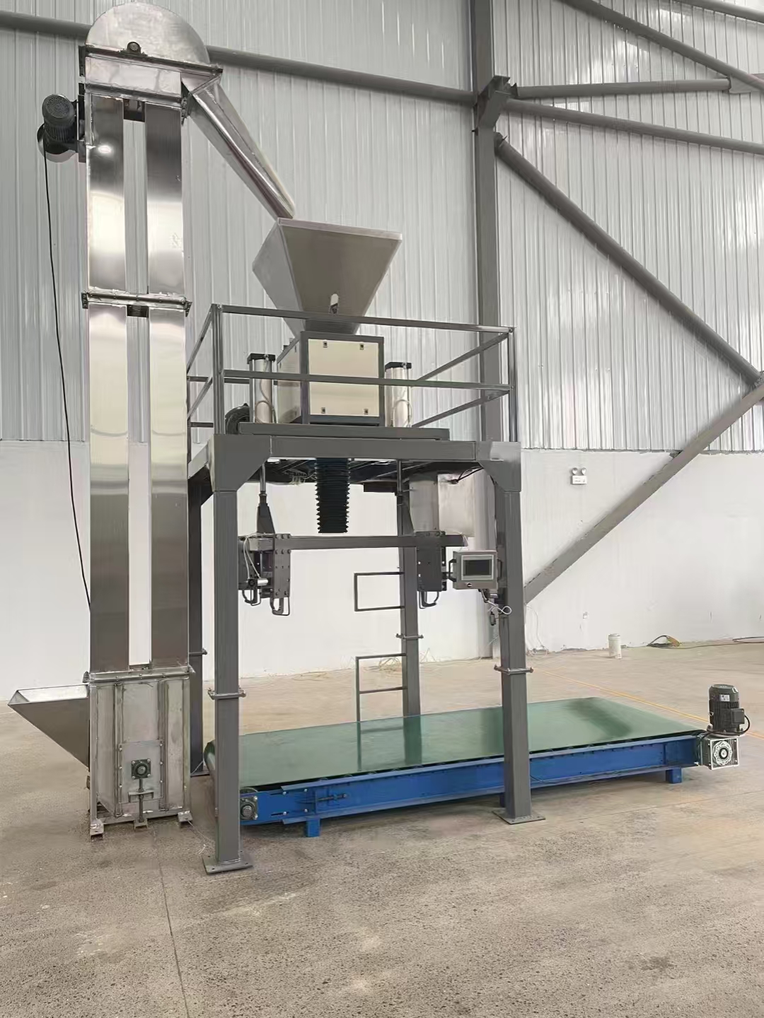 采用重力式自流給料結構,凈重式稱重斗計量 、高精度稱重傳感器,大小二級(或三級)給料精度控制,保證稱重速度及秤量準確度。自動完成夾袋、計量、灌裝、松袋、脫帶、輸送等工作過程。該型號包裝機完全可以滿足高精度、高速度、高生產能力的生產需要,計量稱重能力在40~60包以上。且計量準確度較高,可達到優(yōu)于±0.1%的稱重準確度。