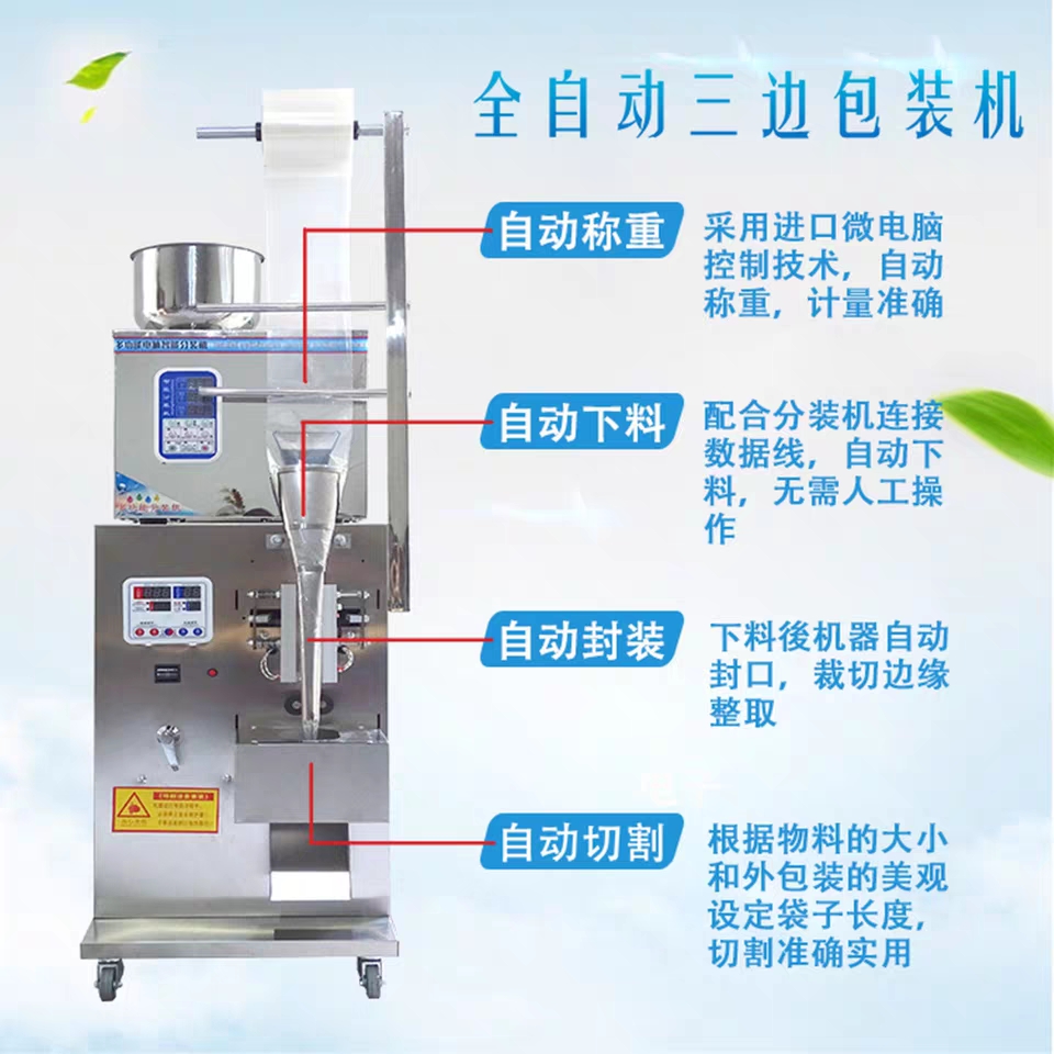 7.彩色觸摸屏和穩(wěn)定可靠的雙軸高精度輸出的PLC控制,制袋、計量、充填、封合、打碼、切袋一次完成.
