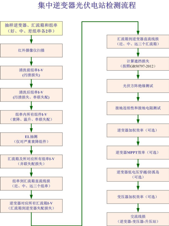 對(duì)于光伏電站第三方檢測(cè)機(jī)構(gòu)或者運(yùn)維服務(wù)公司等,一般會(huì)參考“規(guī)范”第九章節(jié) 光伏電站性能測(cè)試內(nèi)容進(jìn)行測(cè)試。參考眾多光伏檢測(cè)機(jī)構(gòu)的主要檢測(cè)項(xiàng)目,在光伏電站現(xiàn)場(chǎng)可開展的檢測(cè)項(xiàng)目包括紅外攝像(熱斑檢查),污漬遮擋損失,光伏組件性能衰降,光伏組串溫升損失,光伏組件/組串的串并聯(lián)失配損失,EL測(cè)試,光伏方陣相互遮擋損失,直流線損,交流線損,光伏方陣絕緣測(cè)試,接地連續(xù)性測(cè)試,逆變器效率,并網(wǎng)點(diǎn)電能質(zhì)量。對(duì)于諸如逆變器MPPT效率,變壓器效率,并網(wǎng)性能測(cè)試(孤島保護(hù)、有功/無(wú)功功率控制能力、低電壓穿越以及電壓/頻率適應(yīng)能力驗(yàn)證)等測(cè)試內(nèi)容,由于更多涉及的是并網(wǎng)環(huán)節(jié),或在現(xiàn)場(chǎng)無(wú)法開展的項(xiàng)目。